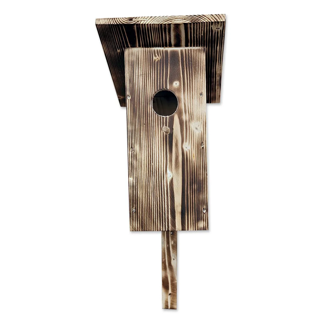 Stylová dřevěná ptačí budka z masivu s opalovaným povrchem, ideální pro zahradu, balkon nebo terasu. Poskytuje bezpečné útočiště pro drobné ptactvo a zároveň slouží jako dekorativní prvek.