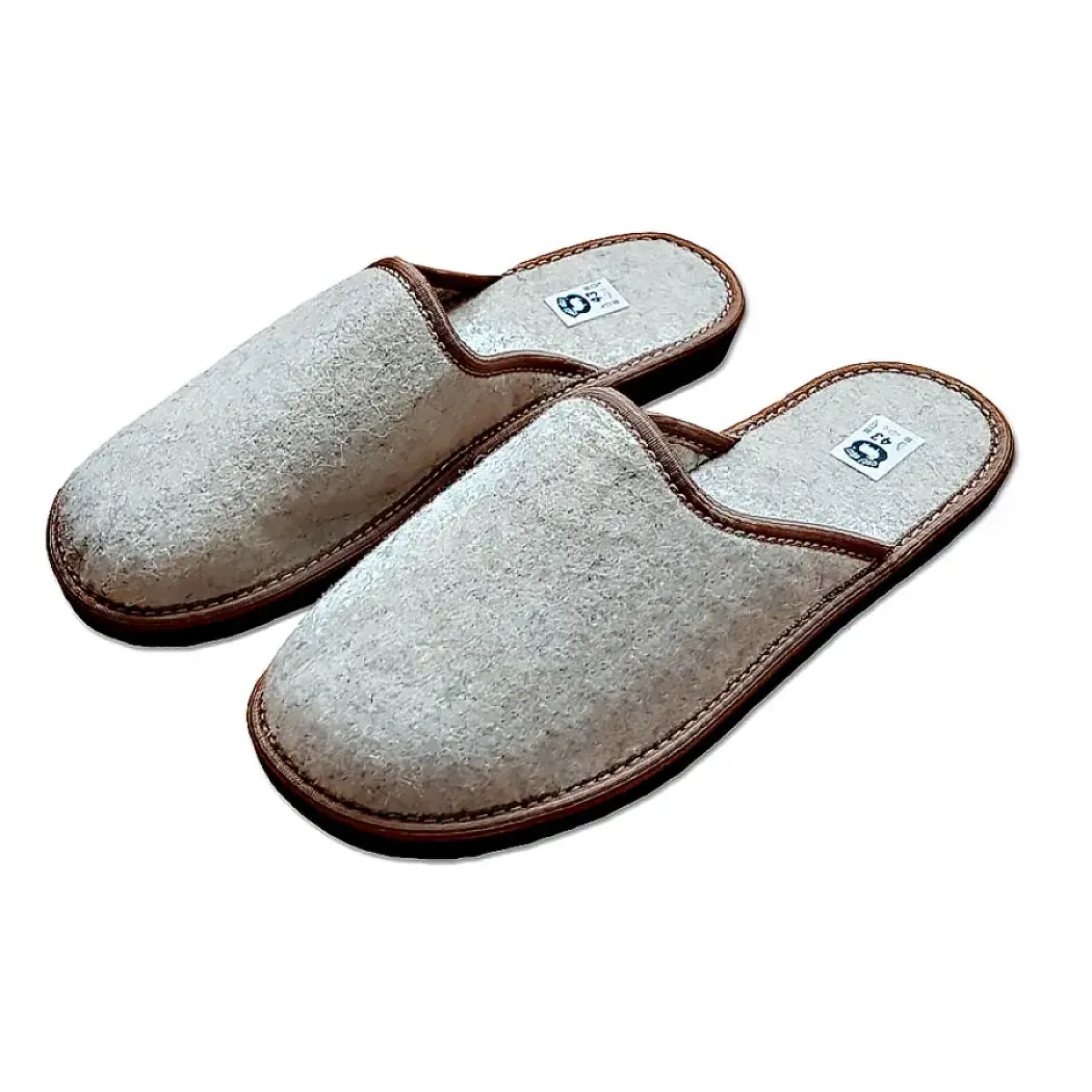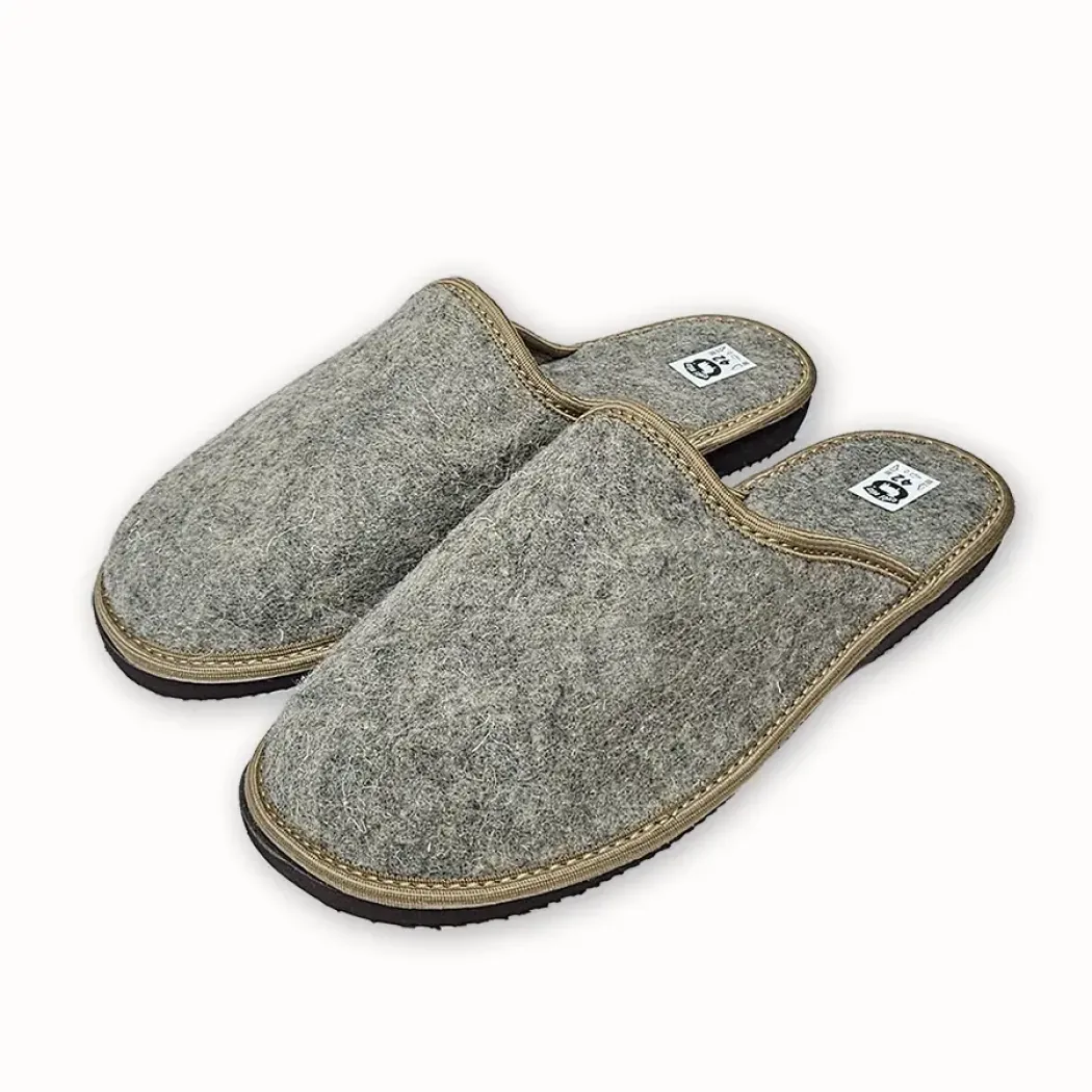 Pantofle filcové s uzavřenou špicí pánské. Svršek tvoří filc vyrobený ze 100% ovčí vlny. Podrážka je pryžová tlumící s ortopedickým klenutím.