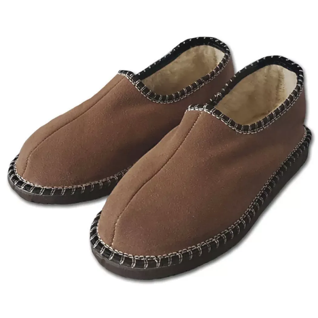 Pohodlné domácí pantofle s ovčí vlnou v tmavě hnědé barvě s podrážkou tlumící nárazy. Uvnitř pantoflí se nachází ovčí vlna. Pantofle mají uzavřenou patu.