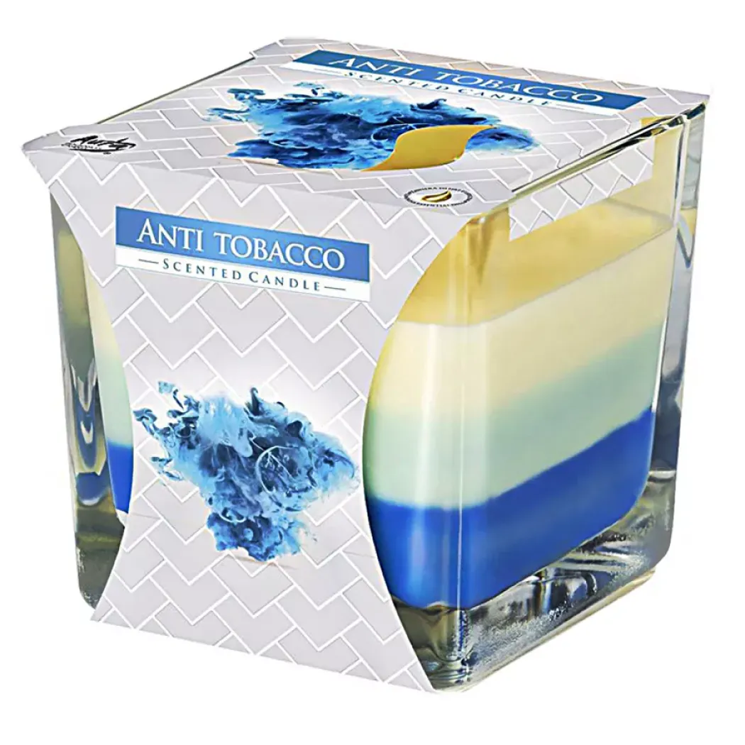 Vonná svíčka ve skle - tříbarevná - Antitabák dvouknotová. Tuto vonnou svíci ocení zejména kuřáci, po prvních minutách zapálení svíce je zápach z kouře eliminován. Vonná svíčka ve skle s prodlouženou dobou hoření a velice příjemnou vůní, která provoní celý byt či dům. Vůně se uvolňuje po celou dobu hoření svíčky a navodí příjemnou atmosféru, pocit klidu a pohody.