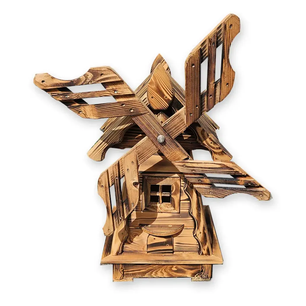 Stylový dřevěný větrný mlýn v rustikálním provedení je originální zahradní dekorace, která dodá vaší zahradě, skalce, terase nebo chatě jedinečnou atmosféru. Díky výrazné kresbě dřeva a jemně opalovanému povrchu působí autenticky a přirozeně zapadne do venkovního prostředí. Zahradní mlýn je vyroben z kvalitního impregnovaného smrkového dřeva, které je odolné vůči povětrnostním vlivům. Precizní ruční zpracování zaručuje dlouhou životnost i vysokou estetickou hodnotu. Dominantou mlýna jsou pohyblivé lopatky, které se otáčejí ve větru a vytvářejí atraktivní dynamický efekt. Díky propracovaným detailům a konstrukci vynikne tato dekorace z každého úhlu pohledu a stane se nepřehlédnutelným prvkem vaší zahrady.